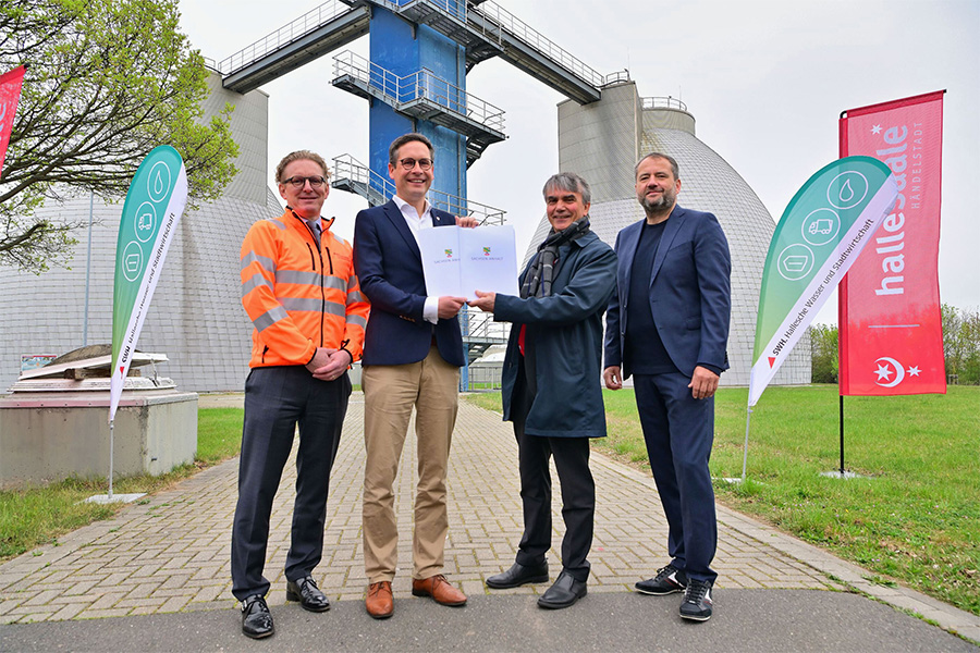 Auf dem Weg zur Energieneutralität hat sich die Stadt Halle (Saale) im sachsen-anhaltischen und bundesweiten Vergleich einen Vorsprung erarbeitet, der gehalten werden soll. Im Rahmen der „Roadmap Klimaneutralität“ der Energie-Initiative Halle investiert die Hallesche Wasser und Stadtwirtschaft GmbH (HWS), ein Unternehmen der Stadtwerke Halle-Gruppe, in technologisch und wirtschaftlich machbare Projekte mit hohem ökologischen und ökonomischen Mehrwert. Bereits im Jahr 2022 startete die HWS das innovative Projekt „Energieautarkes Klärwerk“. Im Rahmen dieses Projektes übergab Dr. Steffen Eichner, Staatssekretär im Ministerium für Wissenschaft, Energie, Klimaschutz und Umwelt des Landes Sachsen-​Anhalt heute am Donnerstag, 17. April 2025, vor Ort auf der Kläranlage zwei EFRE-Fördermittelbescheide an Alexander Vogt, Oberbürgermeister der Stadt Halle (Saale), im Beisein von Peter Günther, Geschäftsführer der HWS und René Walther, Geschäftsführer der Stadtwerke Halle GmbH.