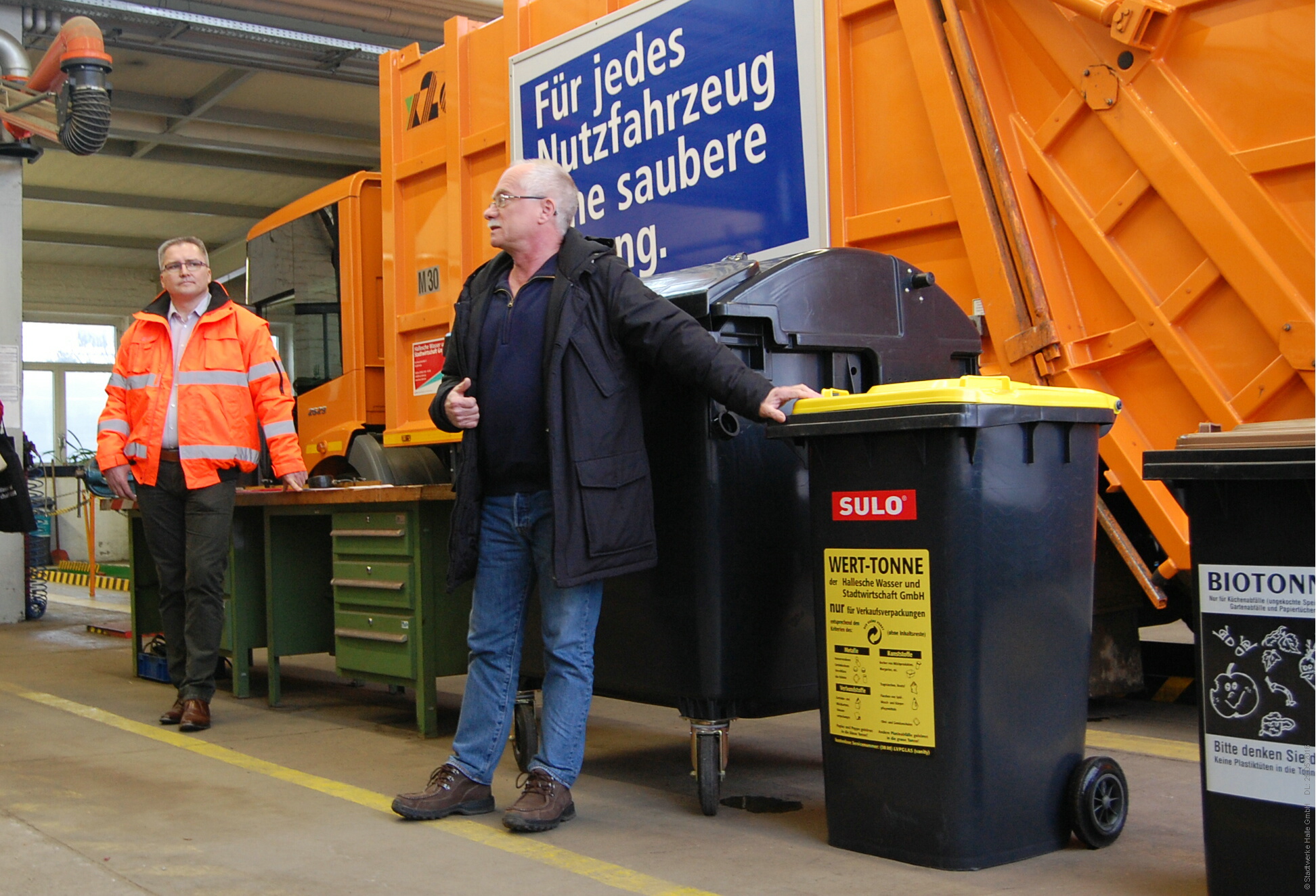 Sven Schossig (links), Abteilungsleiter Reinigung der HWS GmbH, und Dr. Thomas Katterle, Abteilungsleiter Umweltplanung der Stadt Halle, stellen auf dem Gelände der Halleschen Wasser und Stadtwirtschaft GmbH das neue Behälteridentifikationsgerät vor.