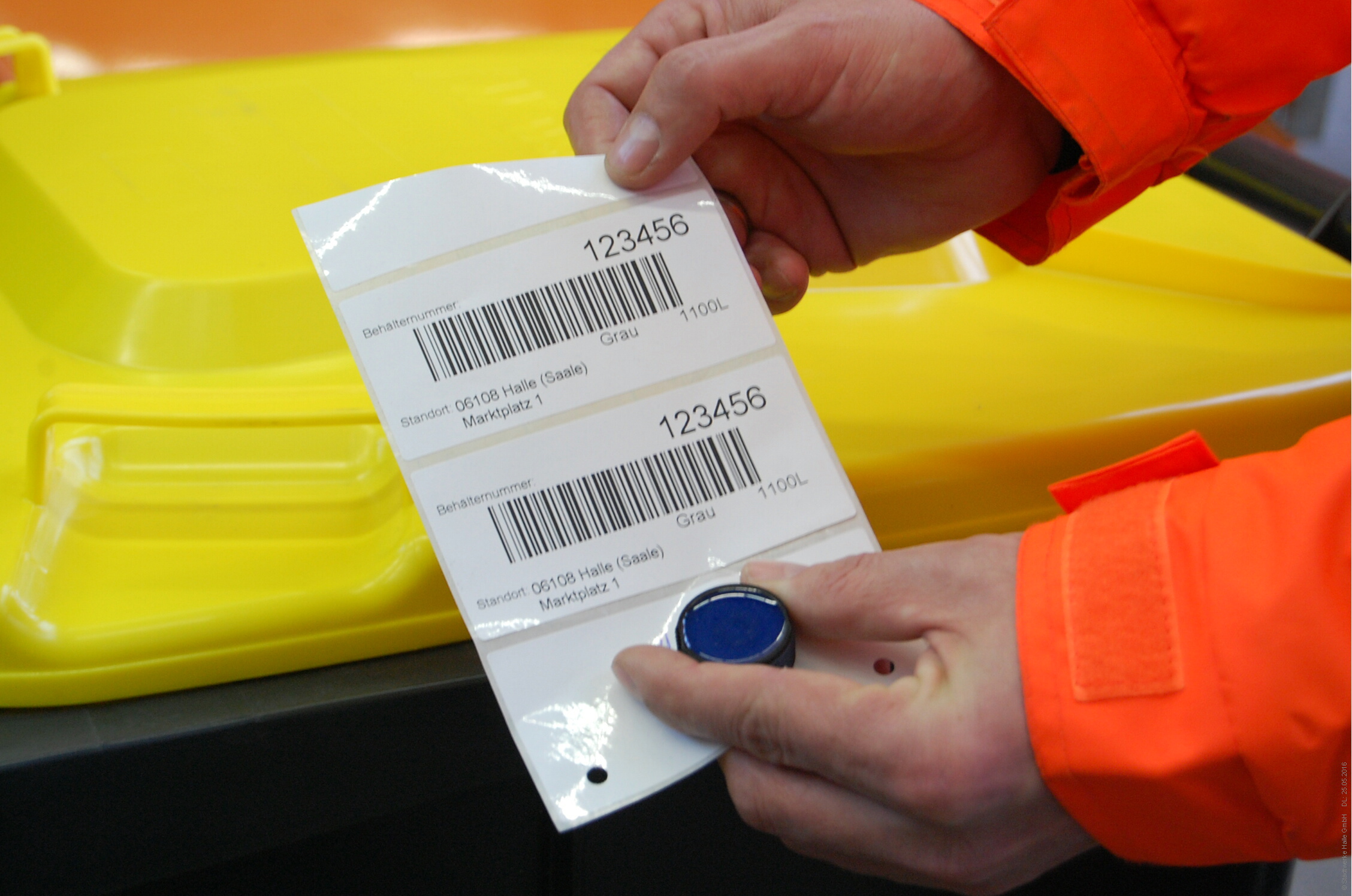 Die HWS GmbH stattet Müllbehälter in ganz Halle (Saale) mit einem elektronischen Chip aus. Zusätzlich wird ein Barcode-Etikett auf die Tonne geklebt, welches die Behälternummer enthält.