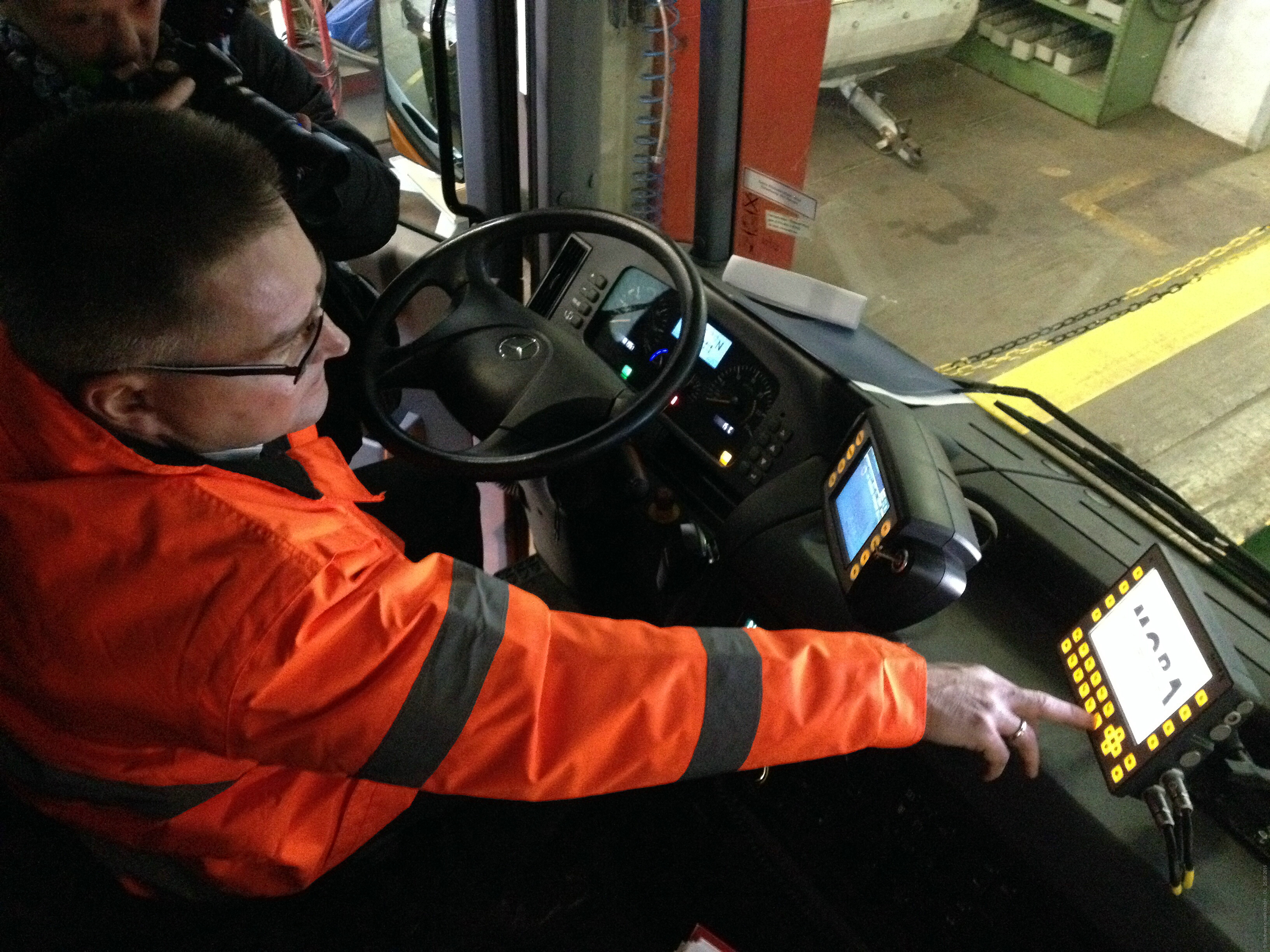 Sven Schossig von der HWS GmbH zeigt auf den neuen Monitor, welcher in der Fahrerkabine der Müllfahrzeuge angebracht wird. Auf diesem können die Fahrer die auf dem Chip und im Barcode gespeicherten Daten einsehen.