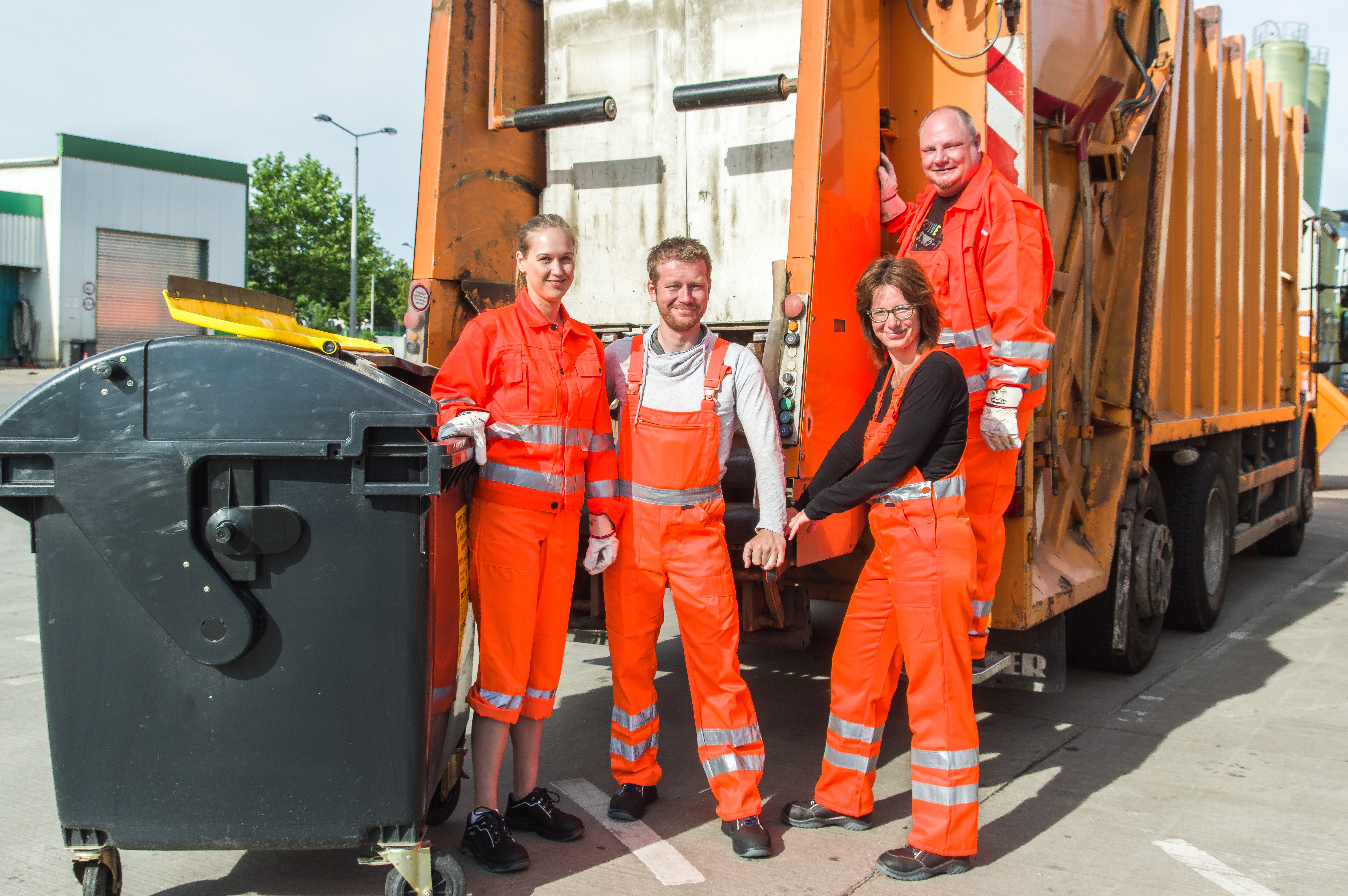 Die vier Stadträte und Aufsichtsratsmitglieder Manuela Plath (Die Linke), Christoph Bernstiel (CDU), Melanie Ranft (Grüne) sowie der Stadtratsvorsitzende Hendrik Lange (Linke) übernahmen am 16. Juni die Entsorgungstour der gelben Tonne.