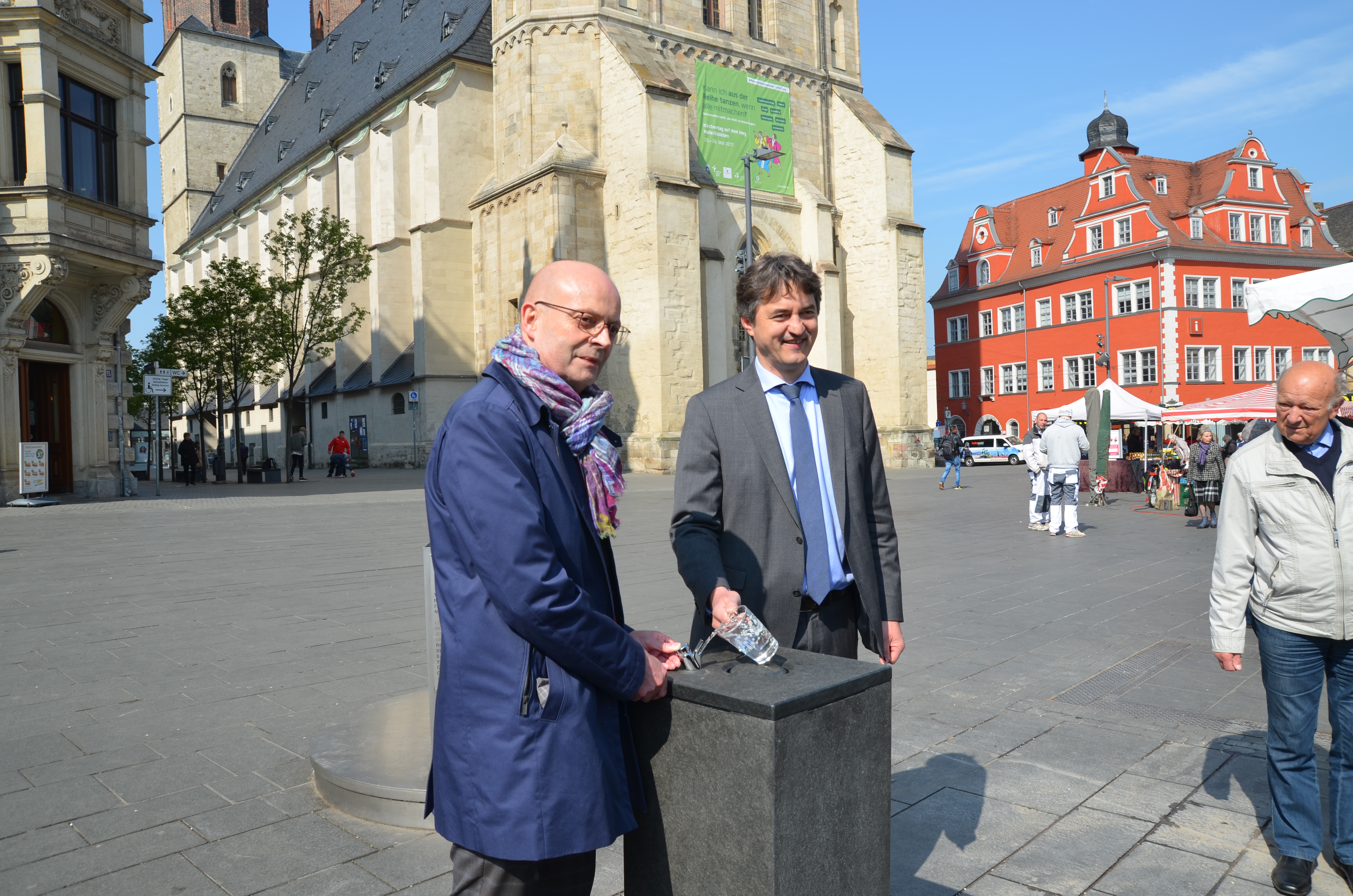 Bei großer Hitze schnell mal einen Schluck halleschen Trinkwassers - natürlich von bester Qualität - trinken und nichts dafür bezahlen: Das geht ab heute in unserer Saalestadt. Denn die Stadt Halle und die Stadtwerke Halle nahmen am heutigen Freitag, den 21. April 2017, zwei neue Trinkbrunnen auf dem Marktplatz und auf der Peißnitzinsel offiziell in Betrieb.