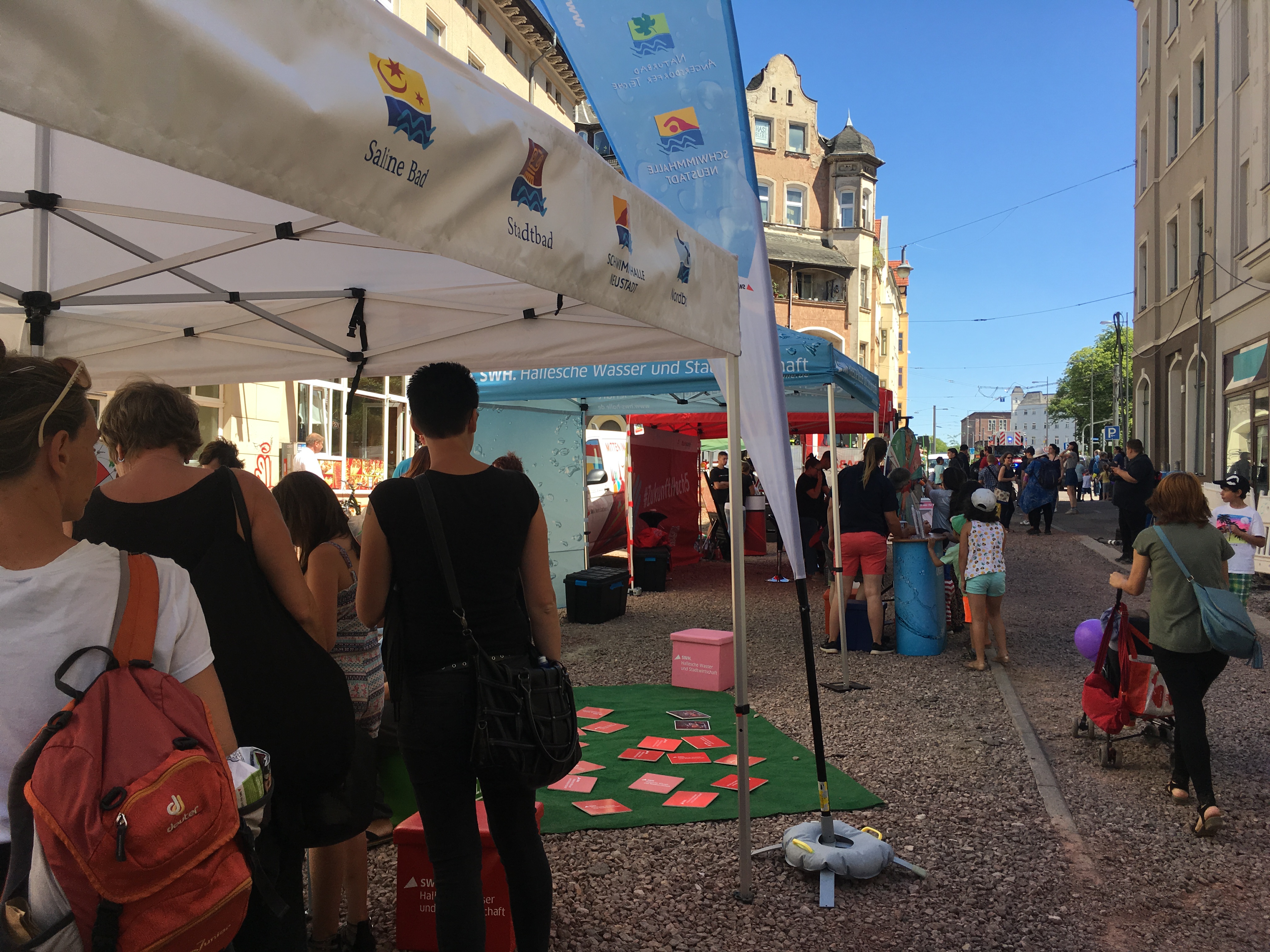 Im Baustellenbüro konnten Funde von archäologischen Ausgrabungen in der Großen Steinstraße, wie ein Tonpfeifenkopf aus dem 17. Jahrhundert, bewundert werden. Bereitgestellt wurden diese vom Landesamt für Denkmalpflege Sachsen-Anhalt. Bei prächtigem Wetter gab es außerdem Spiel, Spaß und spannende Aktionen für Groß und Klein wie eine Minikinderbaustelle der STRABAG, einen Mitmachzirkus, Luftartistik und Torwandschießen oder eine getanzte Modenschau der Modeboutique Klaußnitzer. Für gute Stimmung sorgten Musik, herzhaft Gegrilltes und köstliches Süßes.