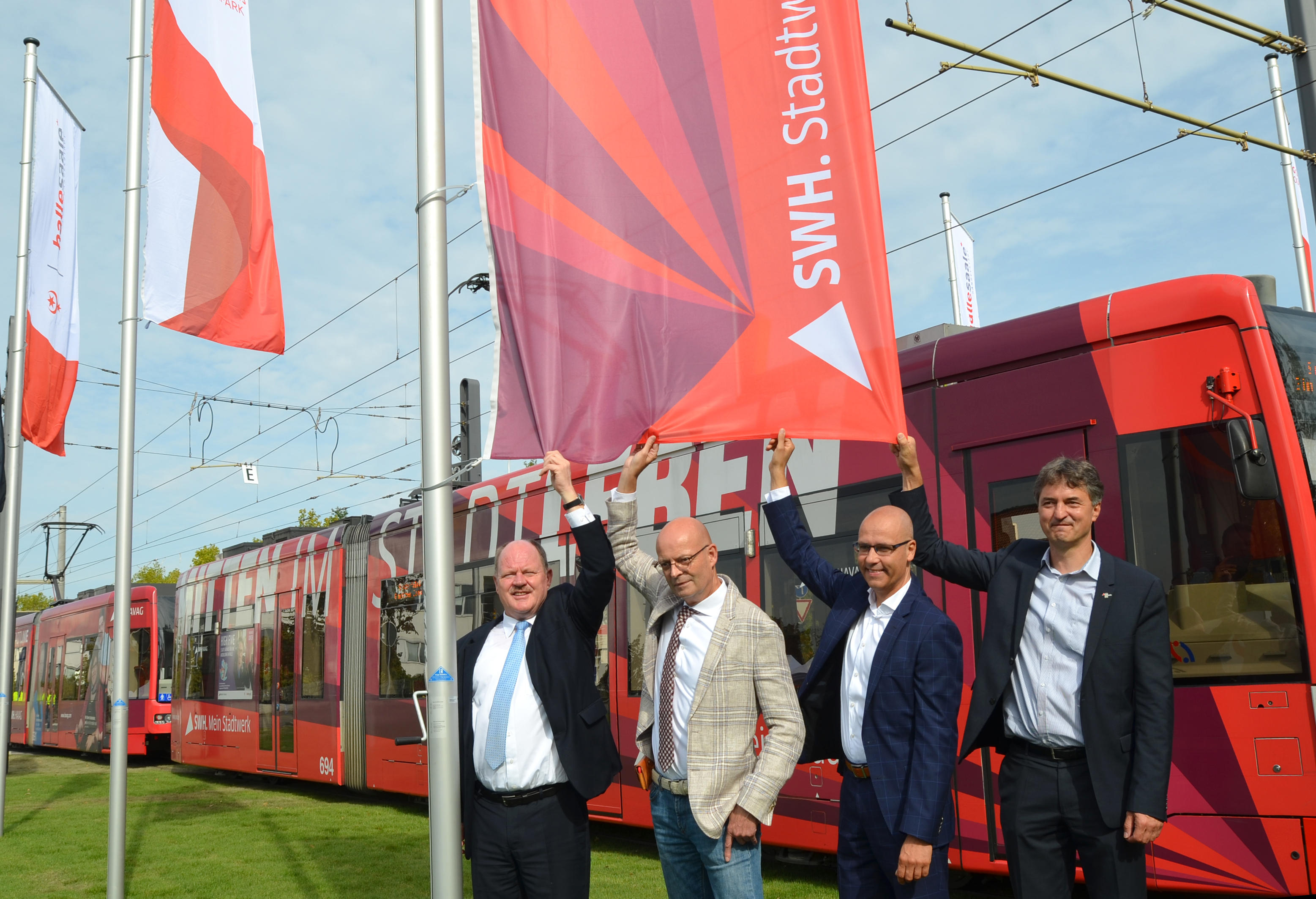 Thomas Webel (Verkehrsminister des Landes Sachsen-Anhalt), Dr. Bernd Wiegand (Oberbürgermeister von Halle/Saale), Dr. Ulf-Marten Schmieder (Geschäftsführer des TGZ) und Matthias Lux (Geschäftsführer der Stadtwerke Halle) hissen symbolisch eine Fahne zur Einweihung des Verkehrsprojektes Gimritzer Damm.