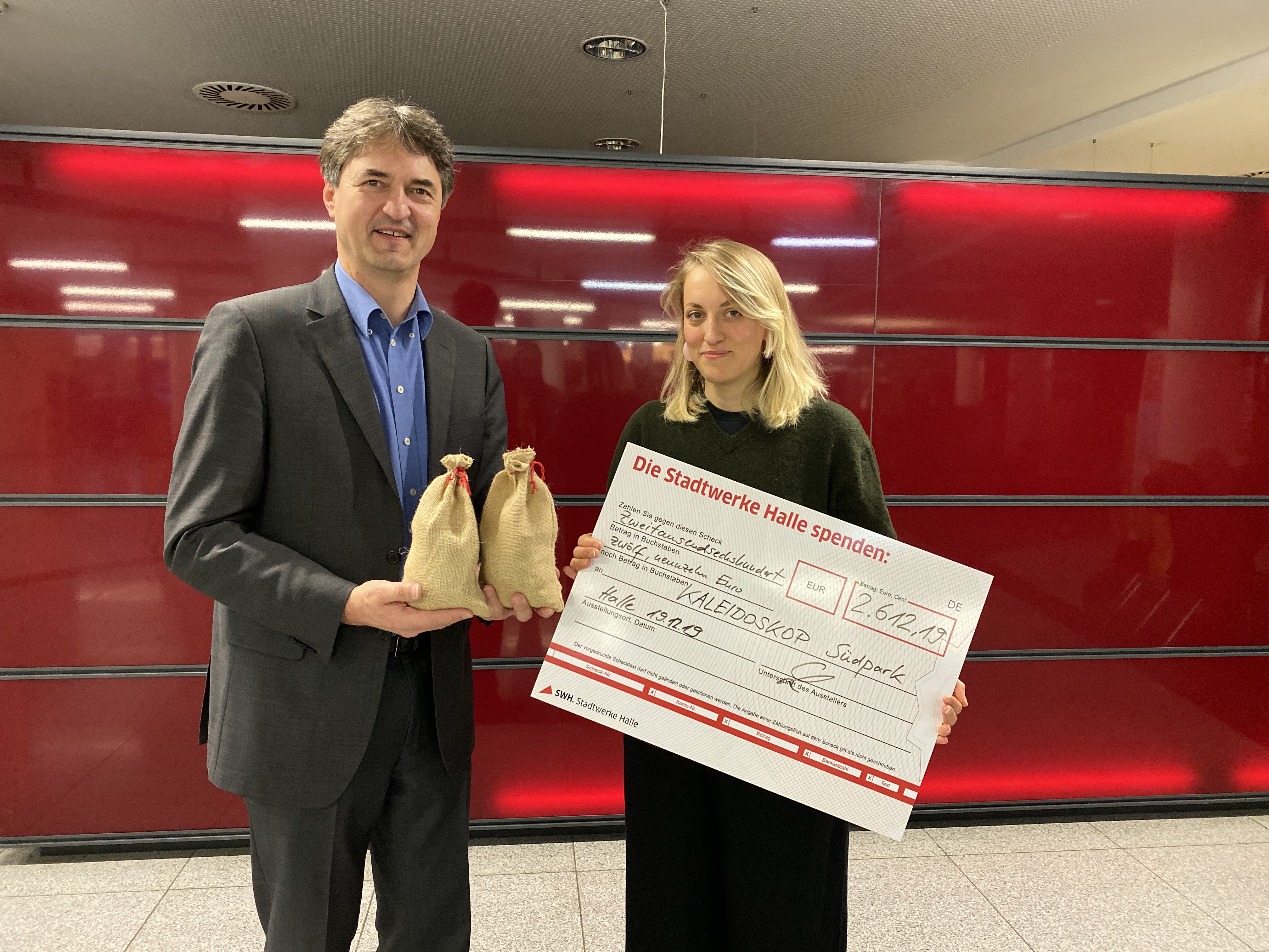 Die Mitarbeitenden der Stadtwerke Halle-Gruppe bewiesen in der Vorweihnachtszeit im Rahmen einer betrieblichen Weihnachtsfeier ein großes Herz und sammelten Spendengelder für den Verein „KALEIDOSKOP Südpark – ein Mitmach-Projekt für Kinder und Jugendliche von Mio e.V.“. Unter dem Motto „Wiederverwenden statt wegwerfen“ hatten die Stadtwerke zudem ihre alten Lichterketten zu einem symbolischen Preis verkauft, um energiesparendere anzuschaffen. Jetzt überreichte Matthias Lux, Vorsitzender Geschäftsführer der Stadtwerke Halle GmbH, die Spende seiner Mitarbeiterinnen und Mitarbeiter in Höhe von insgesamt 2.612,19 Euro an Delphine Bishop, Vorstand des Mio e.V.. Mehr zum Projekt gibt es hier.