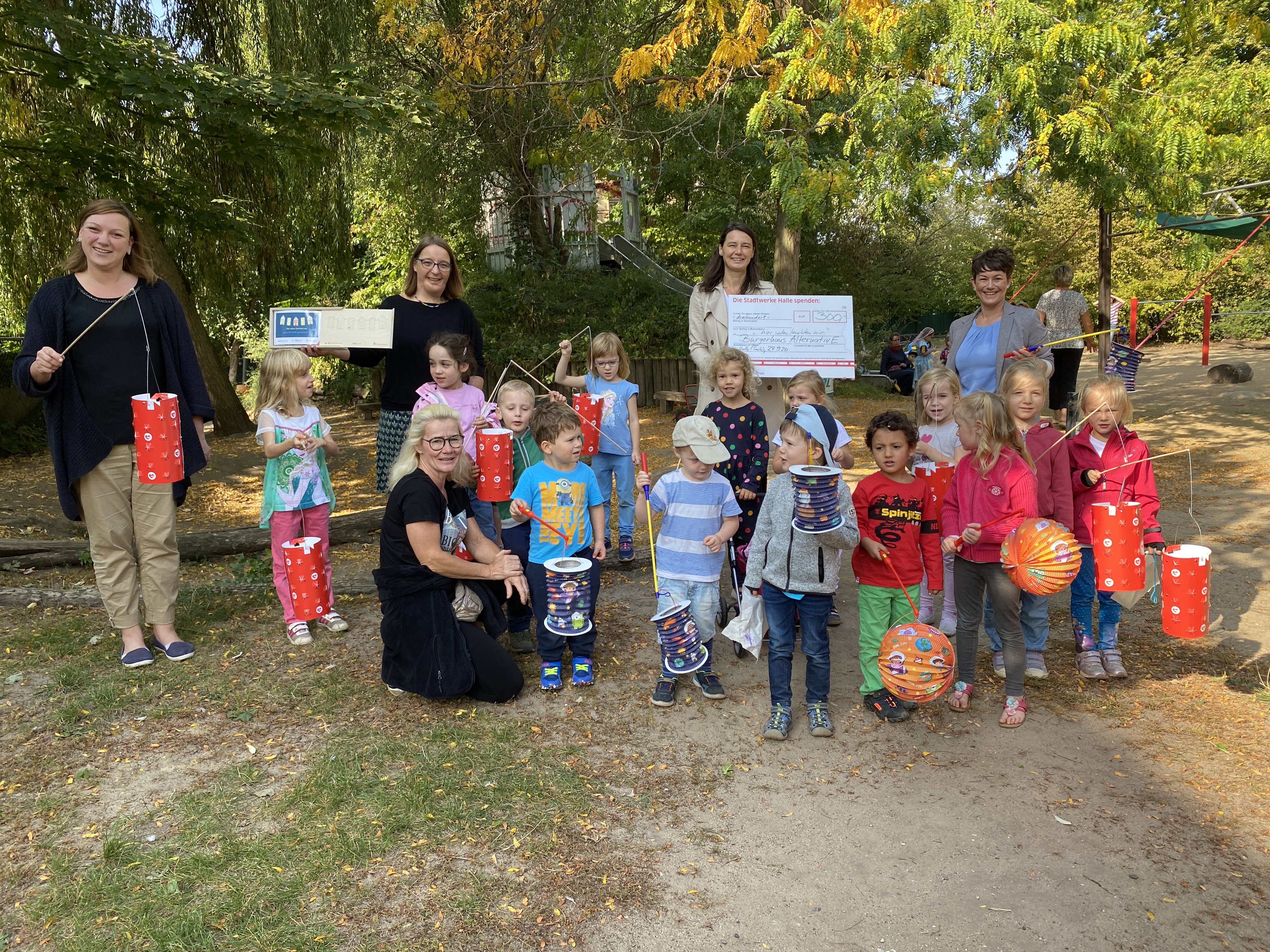 Heute strahlten die kleinen glücklichen Gewinnerinnen und Gewinner der integrativen Kita Eigen-Sinn über beide Ohren. Ihr Glückslos zogen am 27. August 2020 im Rahmen der Aktion „… hier unten leuchten wir“ Oberbürgermeister Dr. Bernd Wiegand, Dr. Jürgen Fox, Vorsitzender Vorstand der Saalesparkasse sowie Matthias Lux, Vorsitzender Geschäftsführer der Stadtwerke Halle GmbH, aus dem Lostopf. Für ihr fleißiges Laternenbasteln gewannen die Kinder den Hauptpreis „Euer KiTa-Stadtwerke-Tag mit vielen Spiel-, Spaß- und Experimentiermodulen!“. Nun wurde der Preis auch offiziell den Vertreterinnen und Vertretern der Kita überreicht. Zusätzlich erhielt das Bürgerhaus AlternativE von allen Partnerinnen und Partnern der Aktion eine Spende in Höhe von 300,00 Euro.